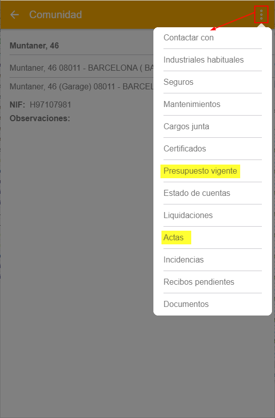 Para una comunidad de propietarios el menú de opciones es éste. Destacamos en amarillo las opciones que son exclusivas de comunidades y macrocomunidades.