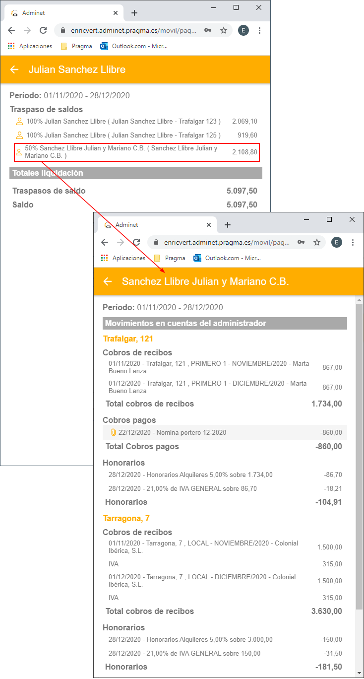 En el estado de cuentas de un perceptor de reparto, se identifican los repartos provenientes de las hojas de liquidación de las que participa. Haciendo clic sobre la línea, se puede consultar el estado de cuentas de esa hoja de liquidación.
